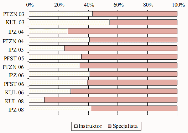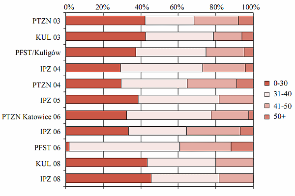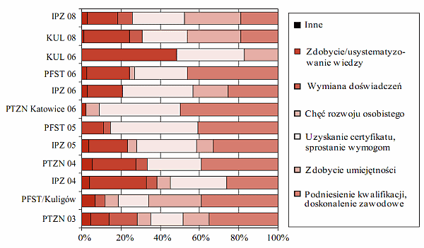 Jeśli weźmiemy pod uwagę wiek uczestników szkoleń, to widzimy, że przystępują do nich osoby coraz młodsze (wykres 2). Tendencję tę widać szczególnie wyraźnie w dwóch ostatnich edycjach szkolenia realizowanych przez KUL i IPZ, które rozpoczęły się w 2007 roku (poddane ewaluacji w 2008 roku). Wykres pokazuje, że ponad 80% szkolących się osób nie przekroczyło 40. roku życia oraz że systematycznie rośnie liczba słuchaczy, którzy rozpoczynają szkolenie tuż po podjęciu pracy zawodowej. Wśród motywów skłaniających do podjęcia szkolenia najczęściej wymieniana jest chęć podniesienia kwalifikacji, doskonalenie zawodowe oraz zdobycie nowych umiejętności. Ważnym powodem pozostaje także kwestia uzyskania certyfikatu i sprostania wymogom formalnym stawianym terapeutom uzależnień. Inne przyczyny to chęć zdobycia lub usystematyzowania wiedzy, wymiana doświadczeń oraz rozwój osobisty.