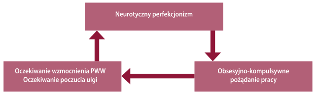 Jak wynika z przedstawionej na rysunku 1. struktury uzależnienia od pracy, obsesja-kompulsja jest jednym z komponentów zjawiska. Koncepcja work craving proponuje uzupełnienie obsesyjno-kompulsywnego trzonu pracoholizmu o dwa dodatkowe elementy − hedonistyczny i poznawczy, wyjaśniających patomechanizmy leżące u jego podłoża. Pracoholik pracuje nieustająco w sposób obsesyjno-kompulsywny, by z jednej strony wzmocnić własne niskie poczucie wartości, a z drugiej strony − uzyskać ulgę (zredukować emocje negatywne i symptomy odstawienne). Ponieważ jednak za sprawą pracowania nigdy nie może tych emocjonalnych efektów osiągnąć na trwałe, musi stale zawyżać sobie standardy dokonań („Nigdy nie jest wystarczająco dobrze”), co w koncepcji work craving określa się mianem neurotycznego perfekcjonizmu.