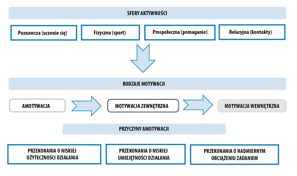 Podstawę teoretyczną skonstruowania baterii kwestionariuszy do badania motywacji (B-KMiA) była koncepcja samodeterminacji (Self-Determination Theory) Edwarda L. Deciego i Richarda M. Ryana10, poszerzona o koncepcje przyczyn braku motywacji (amotywacji). Skonstruowano dwie baterie kwestionariuszy: (a) do diagnozy rodzajów motywacji (zewnętrznej, wewnętrznej i amotywacji) i (b) do diagnozy przyczyn amotywacji (przekonania o użyteczności działania, przekonania o kompetencjach do działania, przekonania o obciążeniu zadaniem). Obie baterie są ze sobą integralnie powiązane zarówno w aspekcie sfer motywowanej aktywności (poznawczej, prospołecznej, sportowej, relacyjnej), jak i sposobu ich wykorzystywania (strategii badania), gdyż w przypadku stwierdzenia deficytów motywacji do działania (amotywacji) w określonej sferze aktywności, można i należy ocenić potencjalne przyczyny jej braku w deficytowych obszarach11. Dokonany wybór koncepcji motywacji podyktowany był jej wysoko ocenianą przydatnością w edukacji12 do diagnozy prognostycznej w obszarze kariery edukacyjnej oraz czynników warunkujących podejmowanie przez uczniów różnych rodzajów aktywności z uwzględnieniem szerokiego ujęcia procesów edukacyjnych związanych nie tylko z realizacją celów poznawczych (uczenia się), ale też z ogólnym rozwojem psychospołecznym (relacje społeczne, aktywność prospołeczna) i fizycznym (aktywność fizyczna). Zakłada się ponadto w tej koncepcji złożoność i niejednorodność ludzkiej motywacji do działania zależnie od typu aktywności/zadania, gdyż w poszczególnych sferach osoba może przejawiać różne rodzaje motywacji, a stan ten może być wynikiem działania różnych przyczyn (nie przejawia się w ten sam sposób w różnych obszarach funkcjonowania)13. Stan amotywacji i rodzaj przejawianej motywacji nie generalizuje się na wszystkie rodzaje aktywności podejmowane przez jednostkę. Wszystko to umożliwia określanie profilu rodzajów motywacji uwzględniających różne sfery aktywności, dając diagnoście podstawę do projektowania działań postdiagnostycznych ukierunkowanych na wykorzystywanie i wzmacnianie aktywności korzystnych rozwojowo oraz eliminowanie czynników ryzyka związanych z przyczynami niepodejmowania aktywności służących rozwojowi w bardzo ważnych jego sferach: poznawczej, relacyjnej, prospołecznej i fizycznej. Wśród dostępnych narzędzi nie znaleziono takich, gdzie sfery te diagnozowane byłyby łącznie, zwykle są to sfery poznawcza albo fizyczna.
