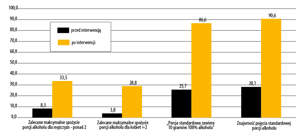 Na etapie ewaluacji widoczne były pozytywne zmiany w wiedzy realizatorów. Przed szkoleniem jedynie co czwarty realizator znał standardowe narzędzie do badań przesiewowych w kierunku nadużywania alkoholu, po zakończeniu projektu – niemal każdy. Co trzeci realizator słyszał o koncepcji krótkiej interwencji w celu ograniczenia ryzyka związanego z piciem alkoholu, a po projekcie znali ją już wszyscy. Nieco bardziej rozpowszechniona była wiedza na temat sesji indywidualnych prowadzonych metodą dialogu motywującego – niemal połowa o nich słyszała, a na koniec projektu – prawie każdy realizator.