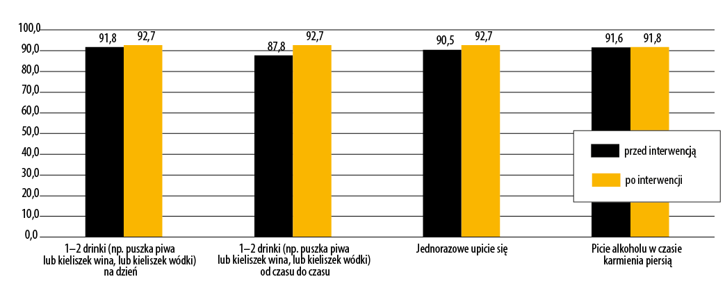 Uczestniczki projektu miały świadomość szkód wynikających z picia alkoholu w czasie ciąży oraz karmienia piersią – niemal wszystkie już na etapie rekrutacji wiedziały, że picie nawet małych ilości alkoholu czy też upicie się jest szkodliwe (najniższy odsetek – 88% zanotowano w przypadku pytania o szkodliwość picia małych ilości alkoholu od czasu do czasu).