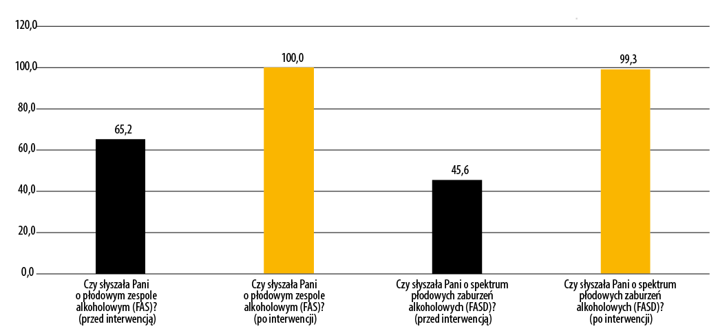 Zwiększyła się też wiedza na temat FASD i FAS. Zdecydowanie bardziej rozpowszechnione jest pojęcie FAS – na początku projektu znało je ponad 65% uczestniczek, pod koniec projektu już wszystkie. Natomiast nieco mniej niż połowa kobiet znała pojęcie FASD, natomiast po projekcie znały je już niemal wszystkie.