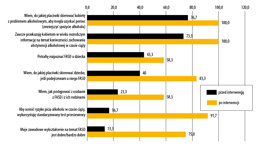 To, co wydaje się ogromną wartością projektu, to wzrost wiedzy realizatorów: jak korzystać z testu przesiewowego AUDIT, jak pracować z kobietą, u której podejrzewają problemy alkoholowe czy też, jak postępować w przypadku osób, u których zdiagnozowano FASD oraz z ich rodzinami. W wyniku udziału w projekcie zmieniły się też postawy realizatorów wobec kobiet pijących w czasie ciąży. Mniej osób deklarowało krytyczny stosunek wobec nich, a więcej uznawało, że powinny otrzymywać taką samą opiekę okołoporodową jak inne pacjentki. Zwiększył się także odsetek osób, które uważają, że kobiety pijące w ciąży powinny zostać objęte specjalistyczną pomocą, a także, że należy je kierować do ośrodka terapii uzależnień. Nie zawsze jednak kierunek zmian w poglądach realizatorów był pozytywny. Zwiększył się odsetek osób, które odczuwały złość w stosunku do kobiet, które piją lub piły w ciąży, a także tych, którzy podświadomie dążą do ich ukarania. Pojawiły się też opinie, których nie było przed realizacją projektu, że należy takim kobietom odebrać dziecko. Być może te opinie związane są ze wzrostem wiedzy realizatorów na temat konsekwencji, jakie powoduje ekspozycja płodu na alkohol. Po zakończeniu projektu realizatorzy ocenili, że wiedza i doświadczenia uzyskane w jego trakcie są bardzo przydatne w ich rutynowej pracy. Mieli też poczucie, że ich działania mają znaczenie, że mają rzeczywisty wpływ ma przebieg ciąży ich pacjentek/podopiecznych oraz że praca z kobietami w ciąży jest satysfakcjonująca.