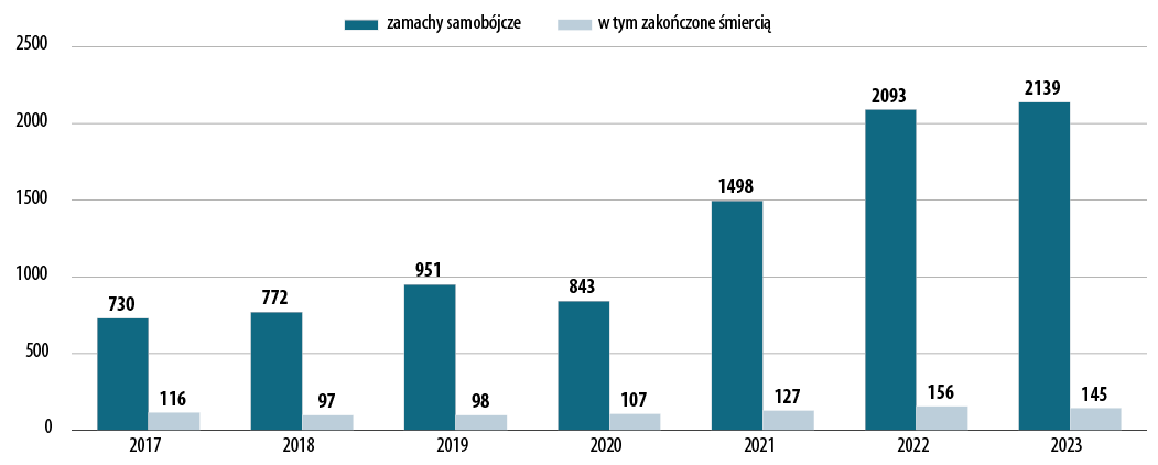 - w 2023 roku odnotowano 2139 prób samobójczych, w tym 145 samobójstw, daje to wzrost tylko niewiele ponad 2% wobec 2022 roku, ale o 54% w stosunku do 2020.