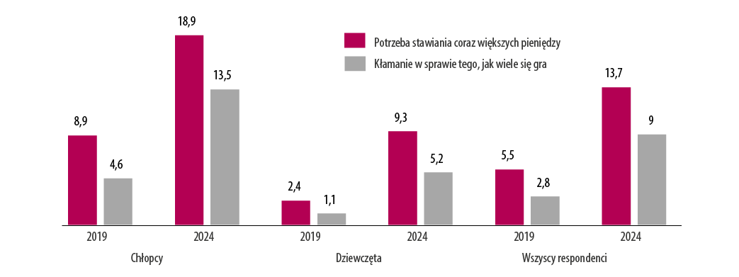 Ponadto zauważalnym problemem jest odnotowany znaczący wzrost rozpowszechnienia zachowań ryzykownych związanych z uprawianiem hazardu. Podczas gdy w 2019 roku 5,5% nastolatków wskazało na odczuwanie potrzeby stawiania coraz większych pieniędzy, to w 2024 roku odsetek ten wzrósł ponad dwukrotnie − do 13,7%. Odsetek chłopców, którzy odczuwali tę potrzebę, był dwukrotnie wyższy niż odsetek dziewcząt, jednak to u dziewcząt różnica na przestrzeni ostatnich edycji badania była większa (wzrost z 2,4% w 2019 roku do 9,3% w 2024 roku). Drugim badanym wskaźnikiem grania problemowego był odsetek uczniów, którzy kłamali w sprawie tego, jak wiele grają. I w tym przypadku odnotowano widoczny wzrost względem ostatniej edycji badania ESPAD – 9,0% uczniów przyznało się do kłamania na temat wydatków na gry hazardowe w 2024 roku, podczas gdy w roku 2019 odsetek ten osiągnął 2,8%. Chłopcy (13,5%) prawie trzykrotnie częściej niż dziewczęta (5,2%) kłamali na temat swoich wydatków, jednak tak jak w przypadku potrzeby stawiania coraz większych pieniędzy, wzrost odsetka wśród dziewcząt był wyższy – z 1,1% w 2019 roku do 5,2% w 2024 roku.